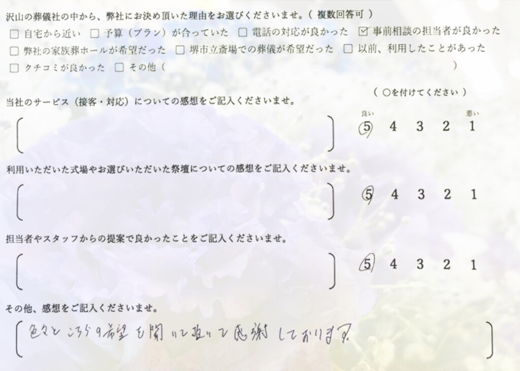 Q:沢山の葬儀社の中から、弊社にお決め頂いた理由をお選びくださいませ。