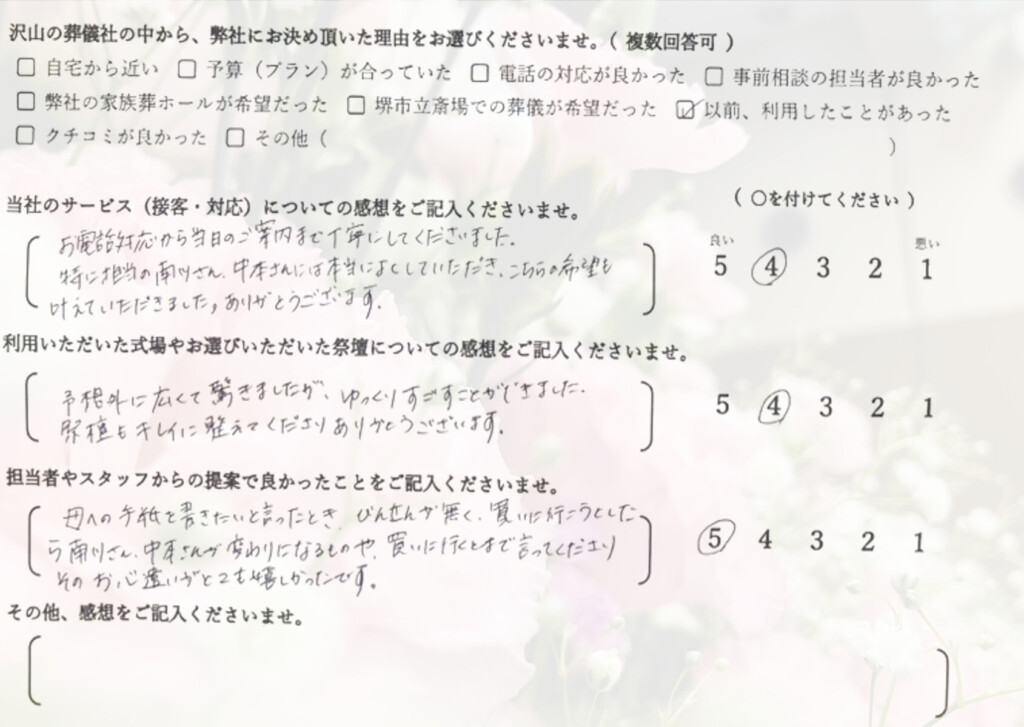 14年ほど前にお父様のお見送りでご縁を頂いており、この度はお母様のお見送りでご縁を頂きました。