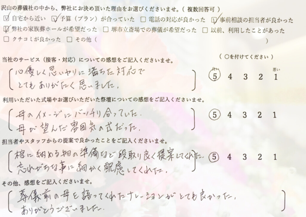 Q:沢山の葬儀社の中から、弊社にお決め頂いた理由をお選びくださいませ。