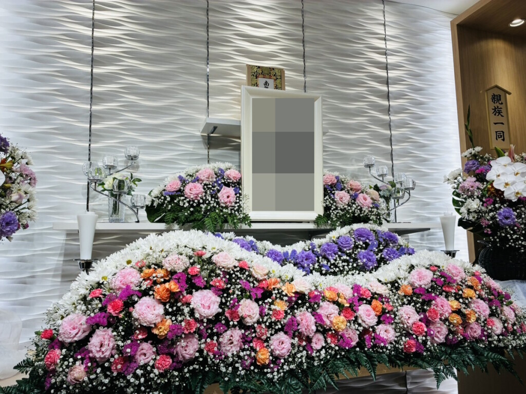 ご本人様は明るいお人柄のようでしたので、祭壇の生花などはポイントで明るい色を入れるご提案をさせていただきました。