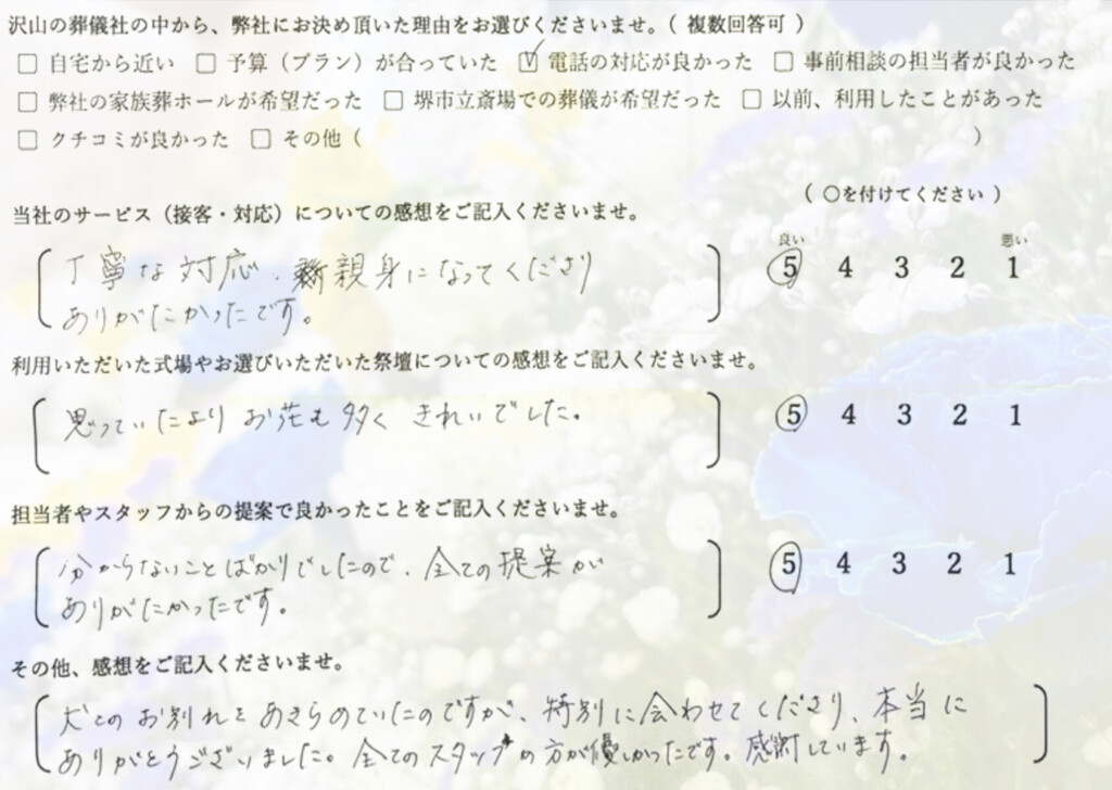 Q:沢山の葬儀社の中から、弊社にお決め頂いた理由をお選びくださいませ。