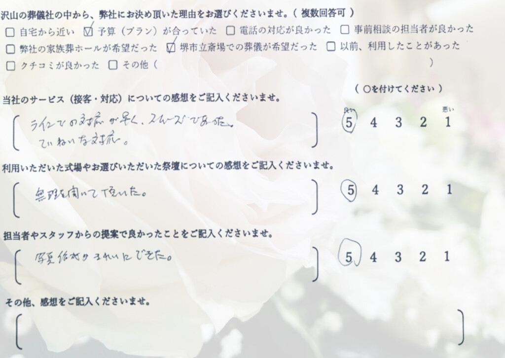 当初、堺市立斎場での葬儀をご希望されており、事前お見積もりの際も堺市立斎場の式場を想定してのお見積もりでした。