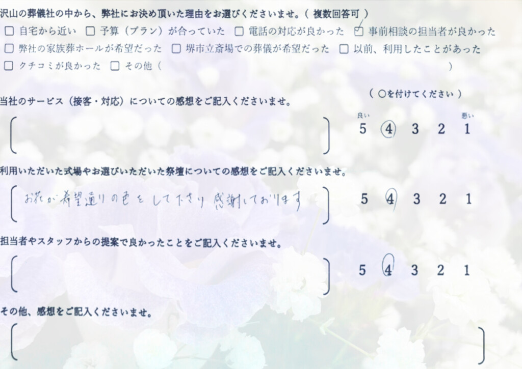 親戚様が車を持っておらず、できる限り堺市立斎場内で完結したいとのご理由で、堺市立斎場の式場をご希望されておりました。