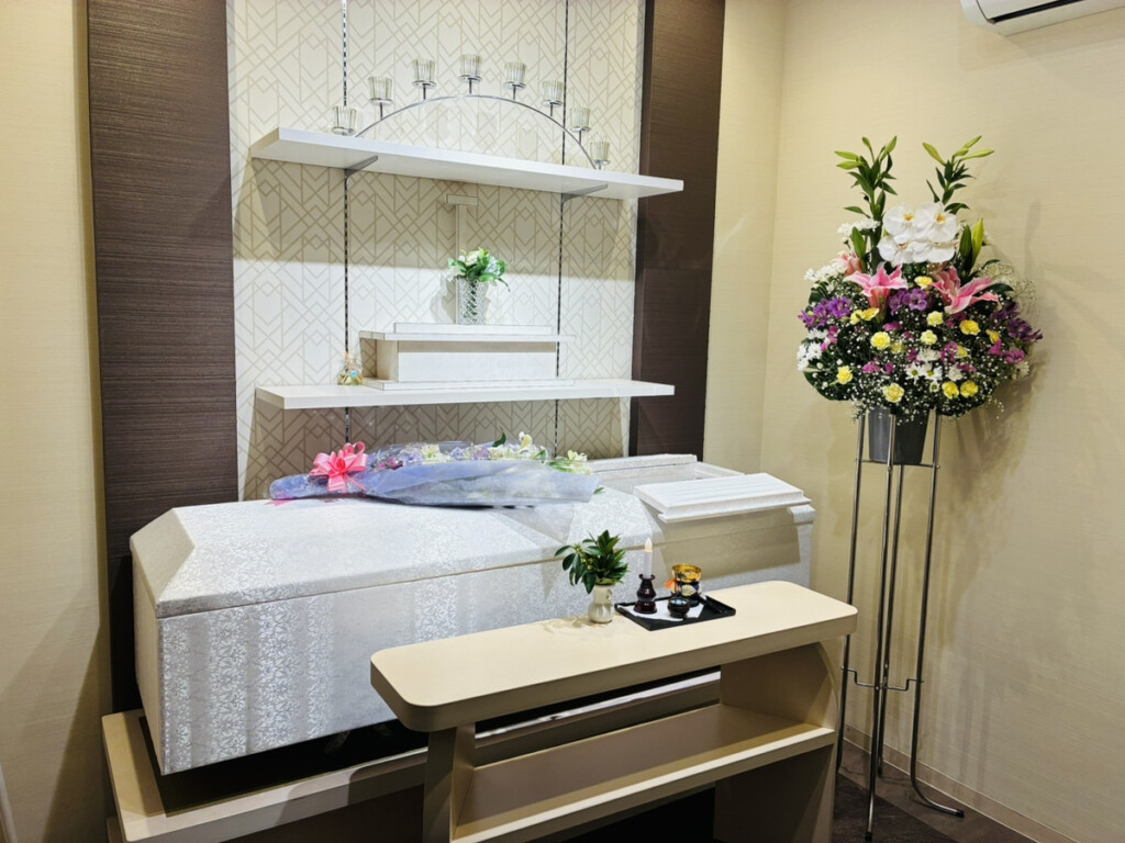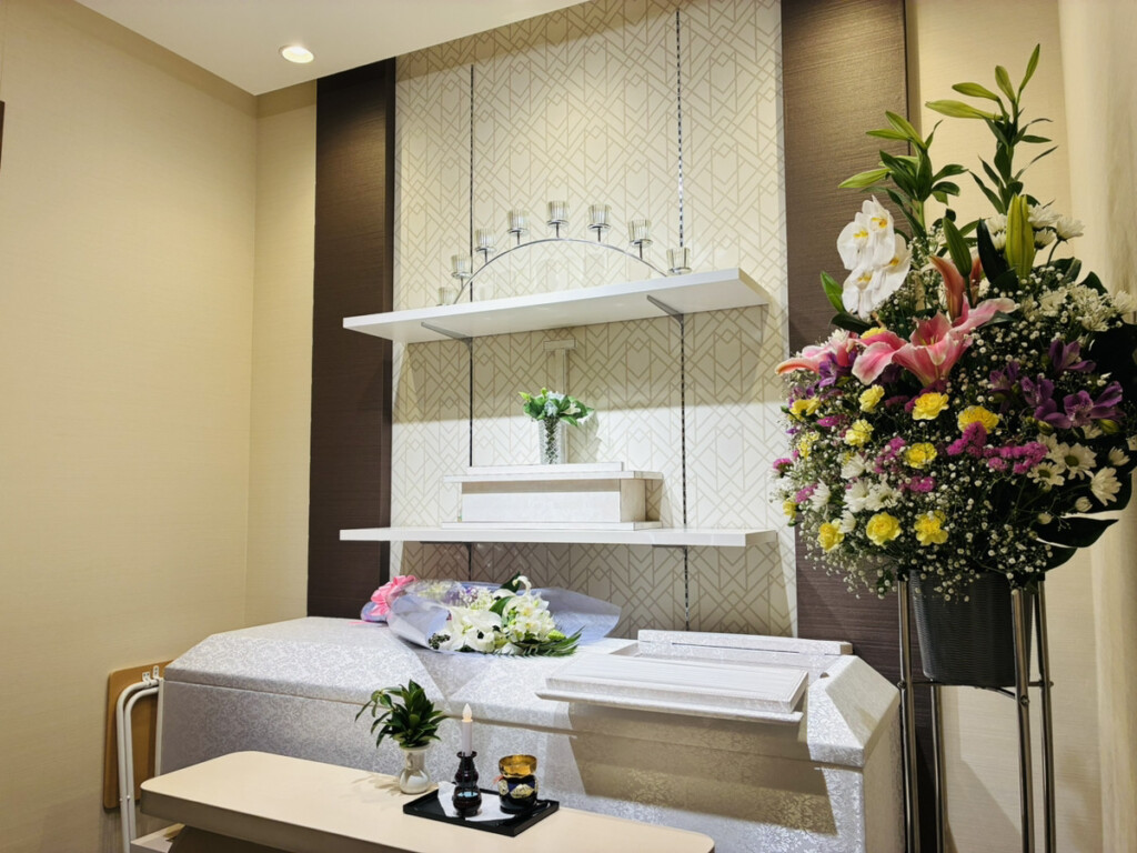 最期のお別れのお時間で棺の中に手向けるお花は欲しいご希望でしたので、供花スタンドとしてお供えし、最期お手向けいただくことをご提案いたしました。