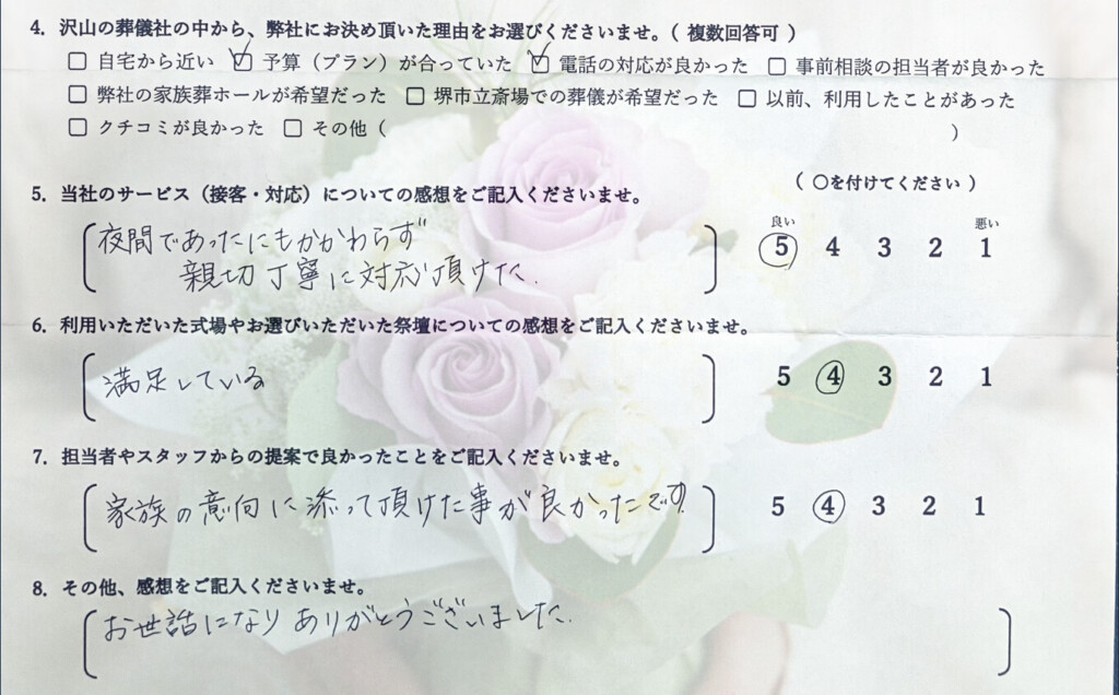 Q:沢山の葬儀社の中から、弊社にお決め頂いた理由をお選びくださいませ。