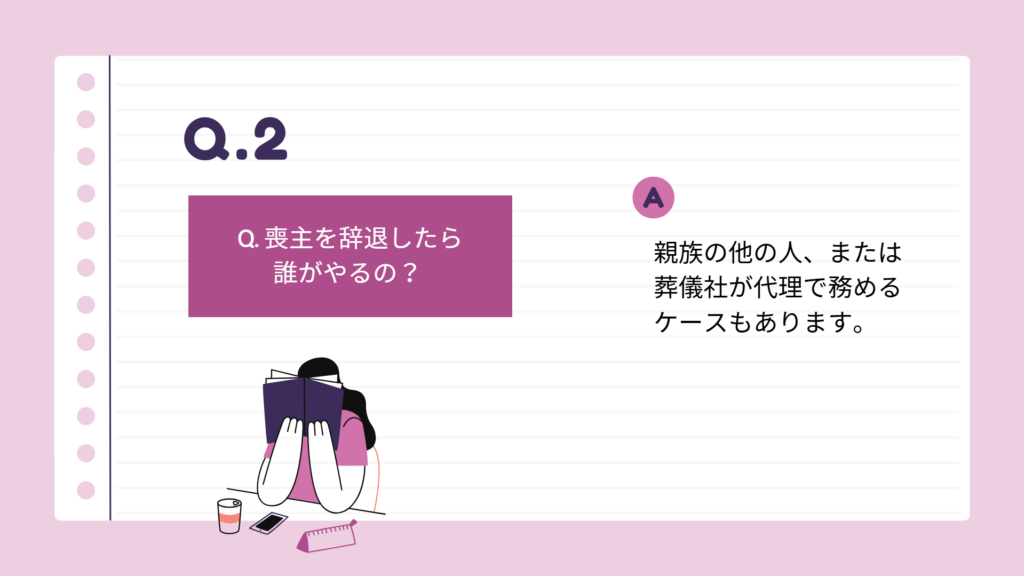 Q. 喪主を辞退したら誰がやるの? A. 親族の他の人、または葬儀社が代理で務めるケースもあります。