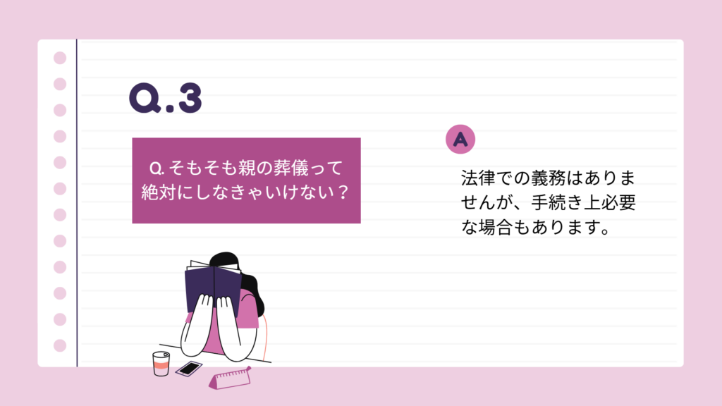 Q. そもそも親の葬儀って絶対にしなきゃいけない? A. 法律での義務はありませんが、手続き上必要な場合もあります。