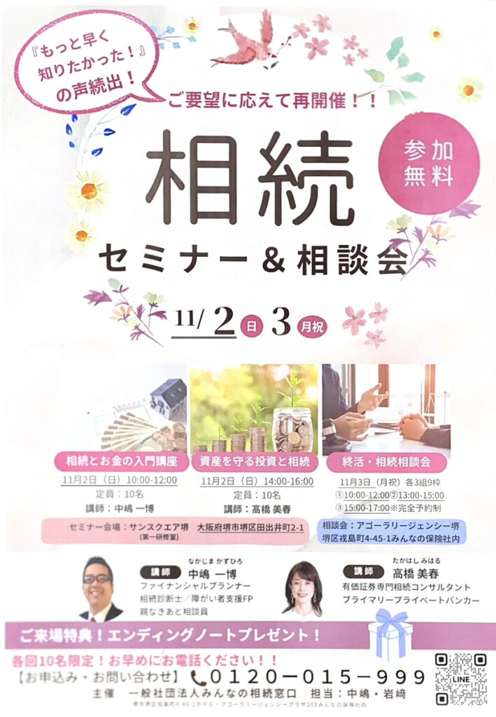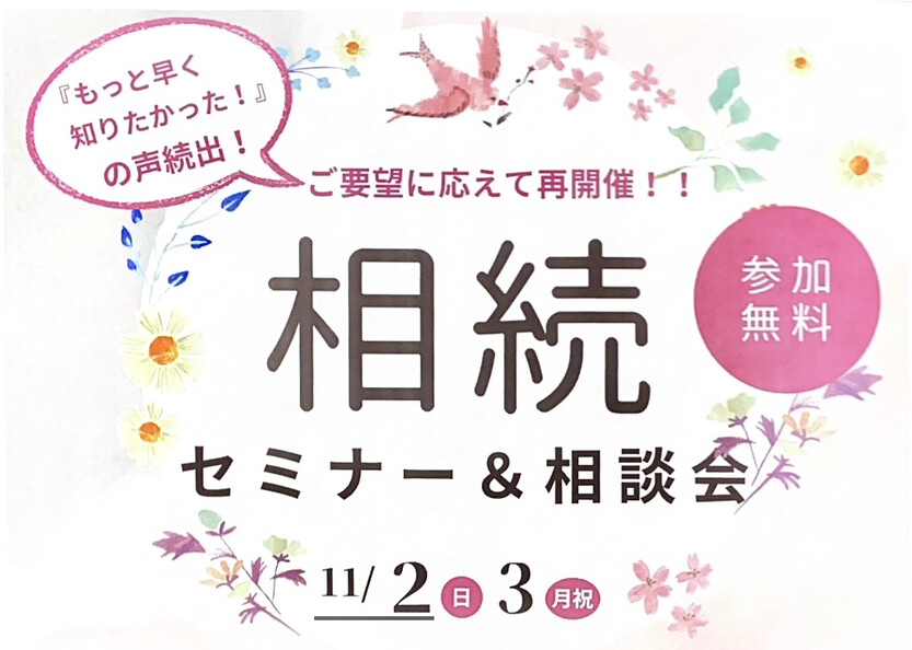【参加無料】プロに学ぶ!相続セミナー&個別相談会 開催のお知らせ(11月2日・3日)