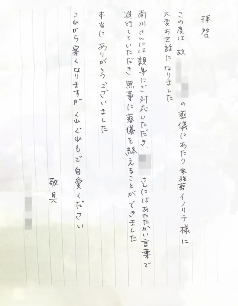 お葬儀後にご家族様より温かなお手紙を頂きました|家族葬イノリテ堺斎場前ホールでの家族葬