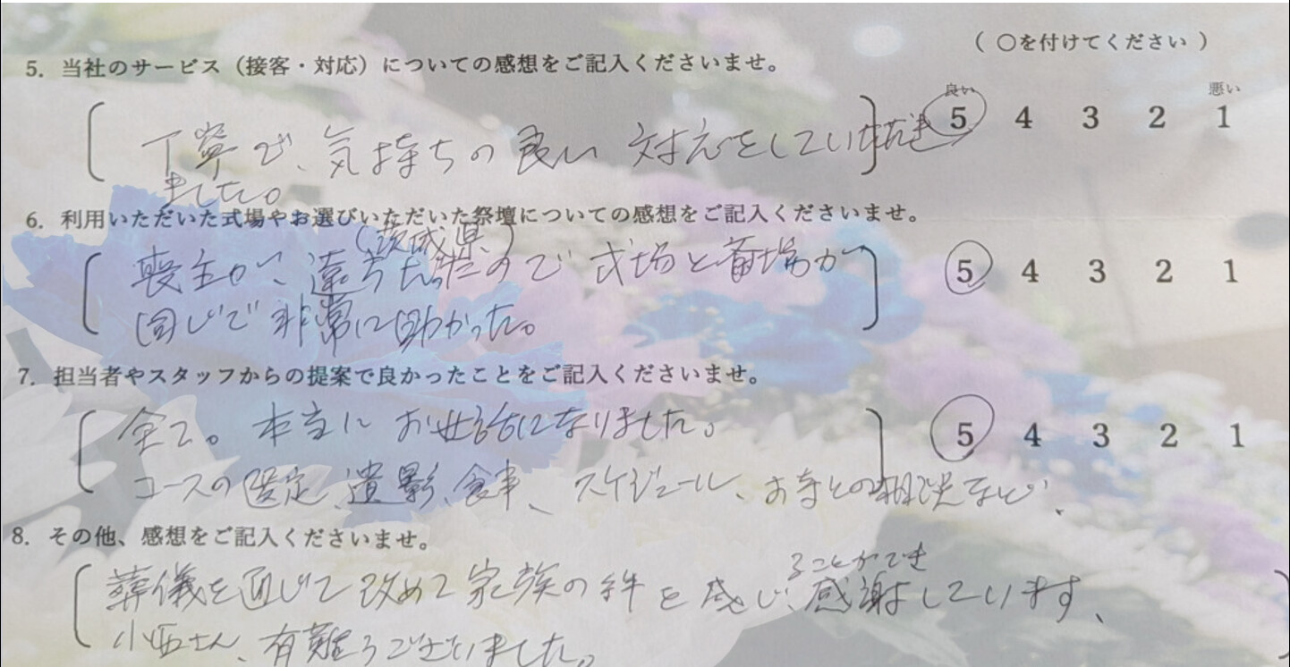葬儀を通じて改めて家族の絆を感じることができ、感謝しています。小西さん、有難うございました。