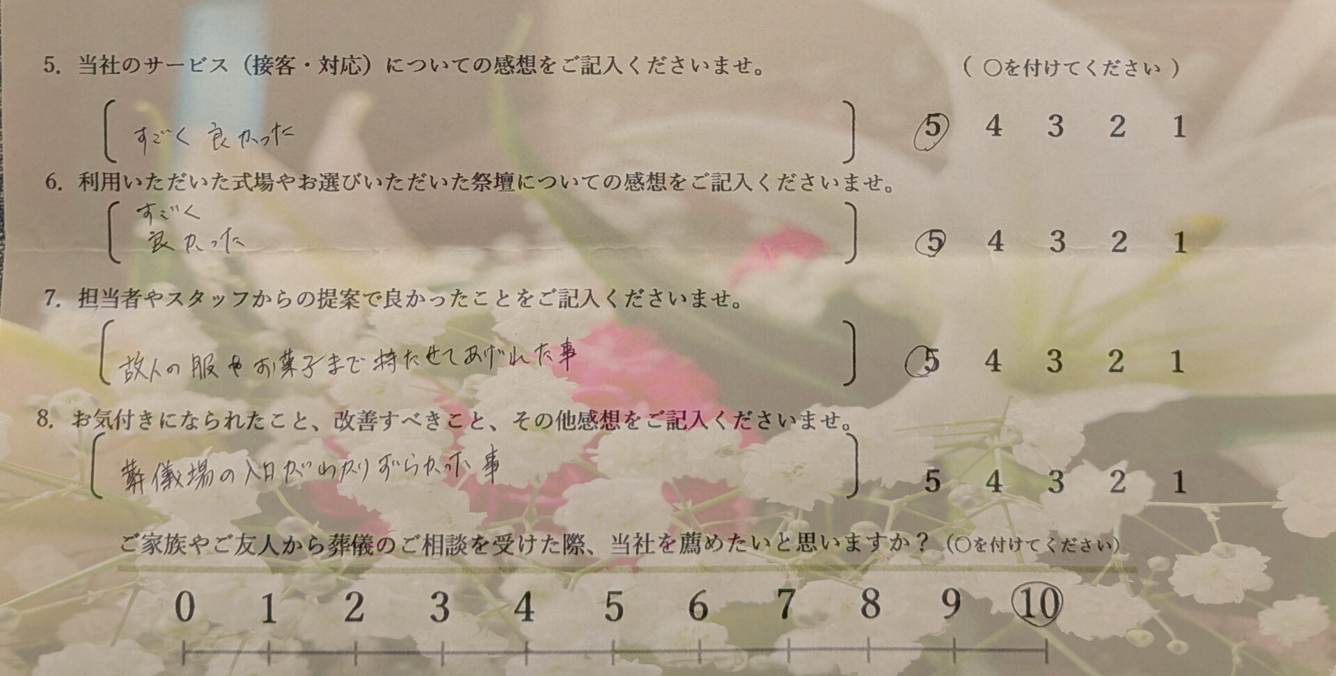 サービスや式場、そして祭壇につきまして「すごく良かった」とのお言葉を頂戴し、安心してお任せいただけたことを大変光栄に存じます。お言葉の一つひとつを拝読し、スタッフ一同、深い喜びと共に今後の励みとして胸に刻んでおります。