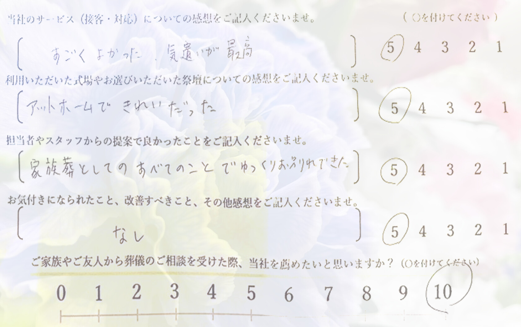そして「家族葬としてのすべてのことで、ゆっくりとお別れができた」とのお言葉をいただけたことは、何より嬉しいことでございます。